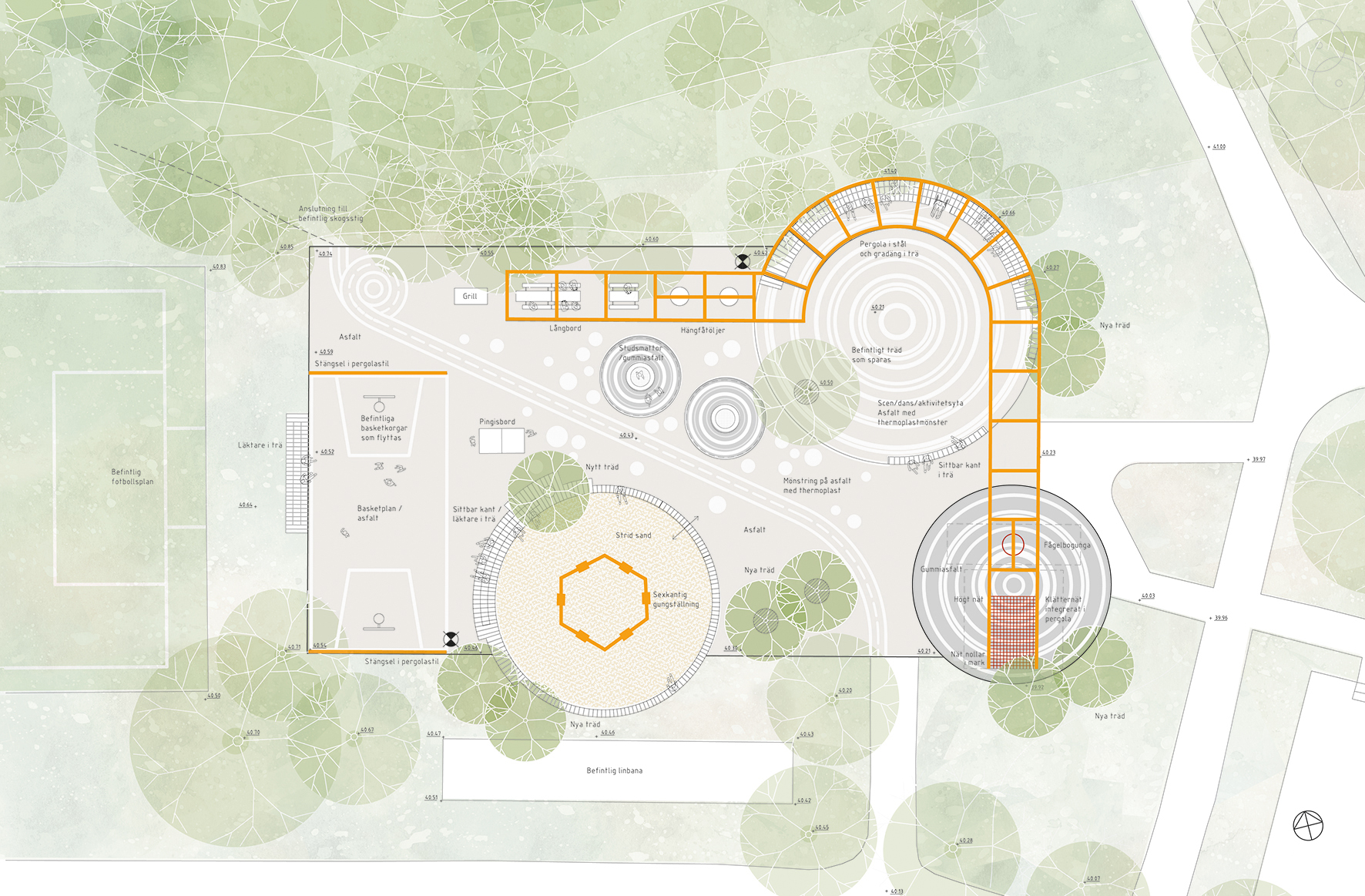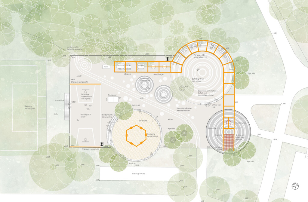 The proposal responds to the fact that the site is presently dominated by a football pitch, used mainly for organized sports events for boys and men. The focus group, in contrast, emphasized the importance of creating a safe and vibrant space for everyone, where friends, siblings, parents and relatives could spend time together. Through a series of workshops, the project developed a design for a park that would stimulate spontaneous physical activity more broadly. A pergola and a stage with stepped seating contributes to a park which can be used throughout the day and in all seasons.