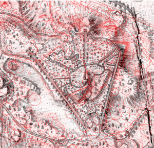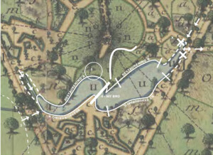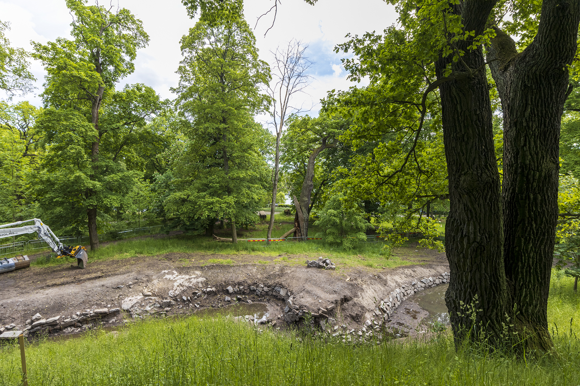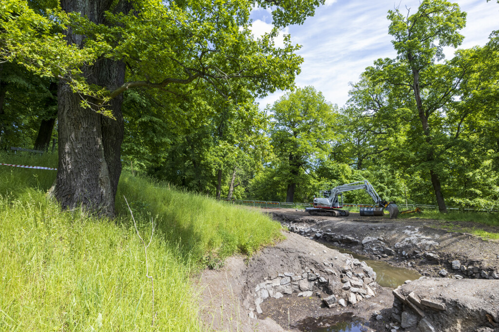 I det höga gräset syntes bara en svacka nedanför utsiktskullen. På flera historiska kartor fanns en damm illustrerad i detta läge. Dammen ligger i en naturlig lågpunkt i landskapet och är formmässigt anpassad till uppstickande berg. Vid den arkeologiska undersökningen hittades stensatta kanter på södra sidan. När dammens kanter mättes in och utbredningen överlagrades med historiska kartor visade sig 1777-års karta ha mycket god överensstämmelse med dammens form. Slutsatsen är att dammen anlades i slutet av 1700-talet och varit i bruk till mitten av 1800-talet. Därefter har dammen fyllts igen.