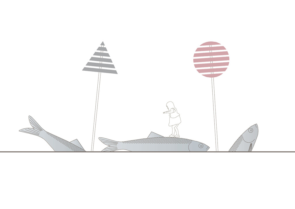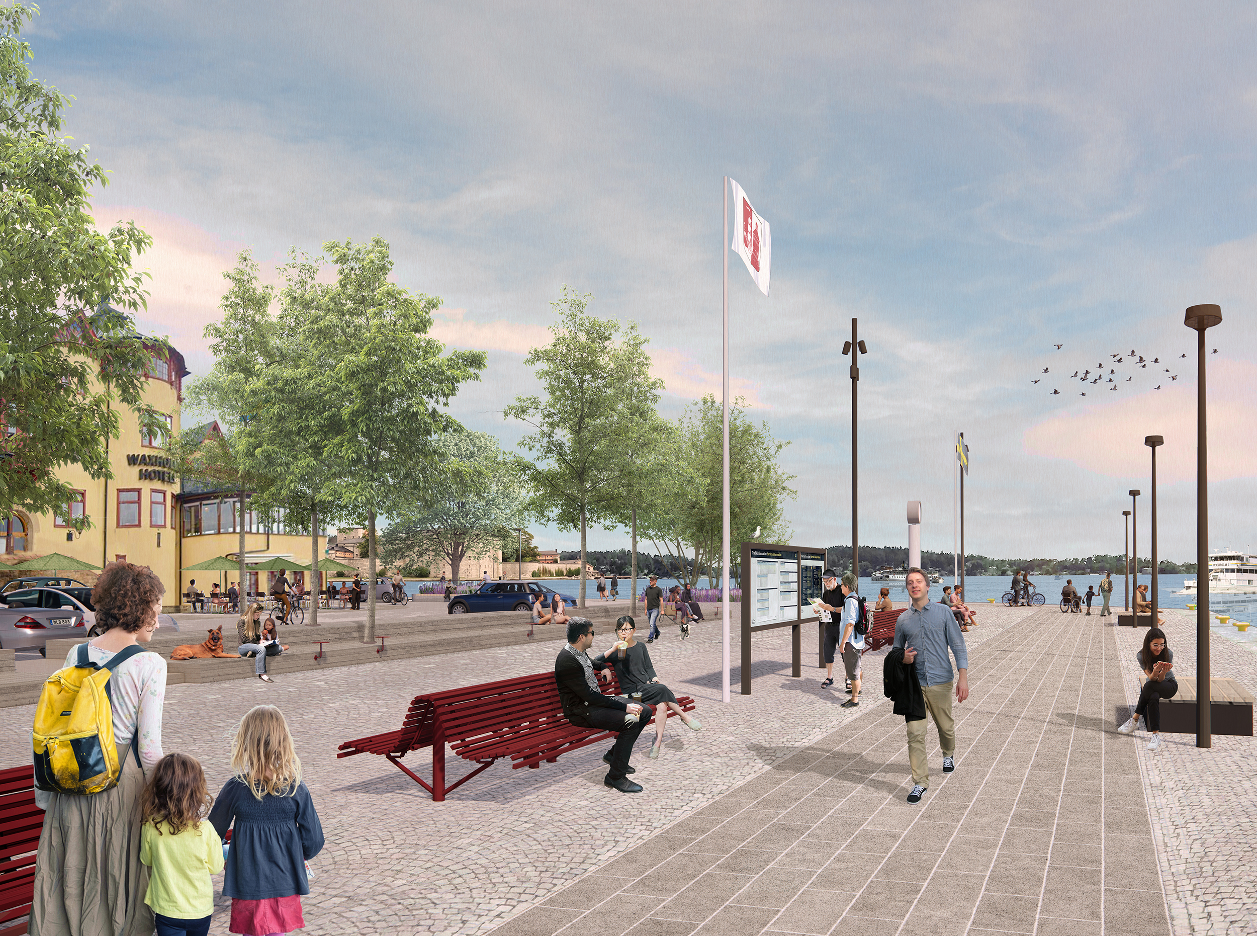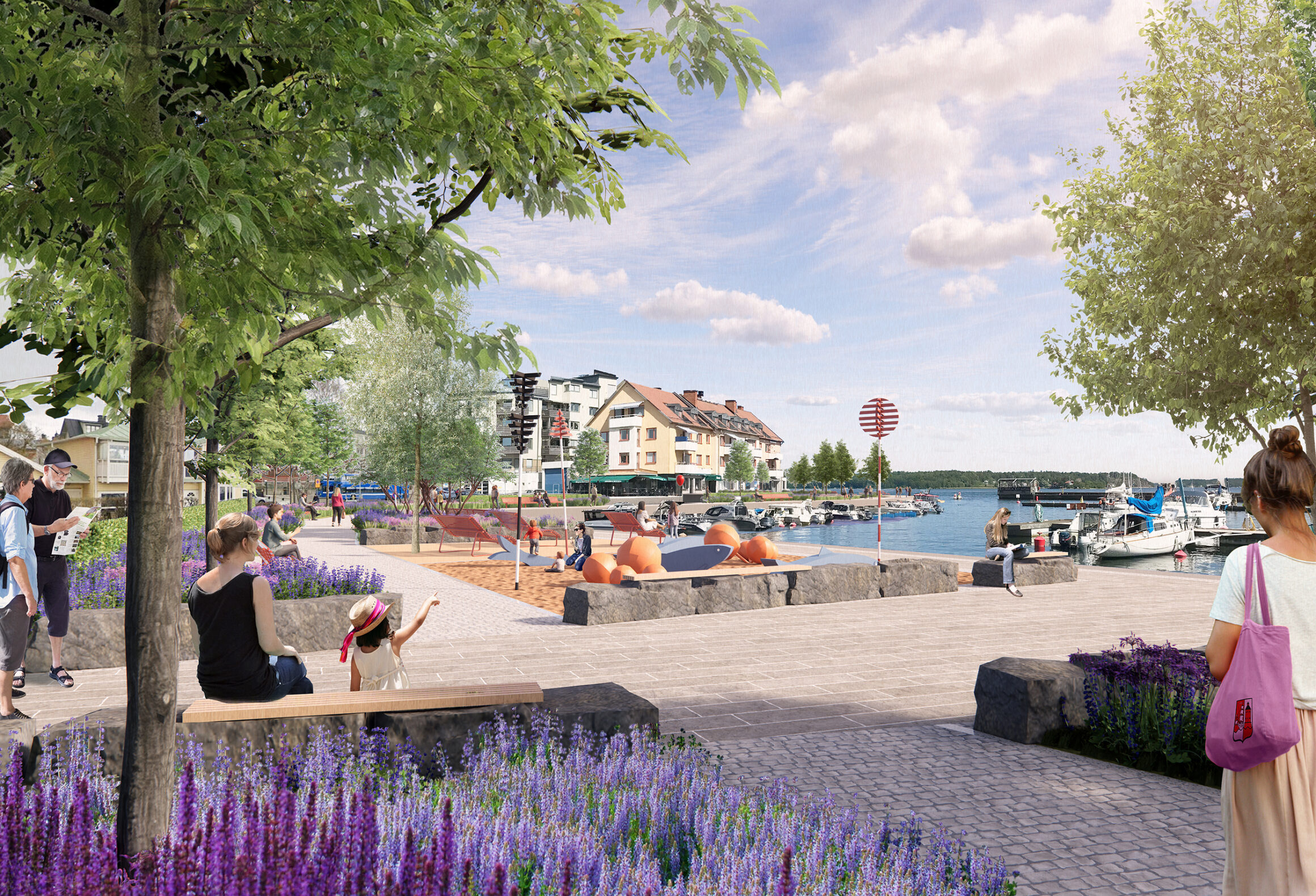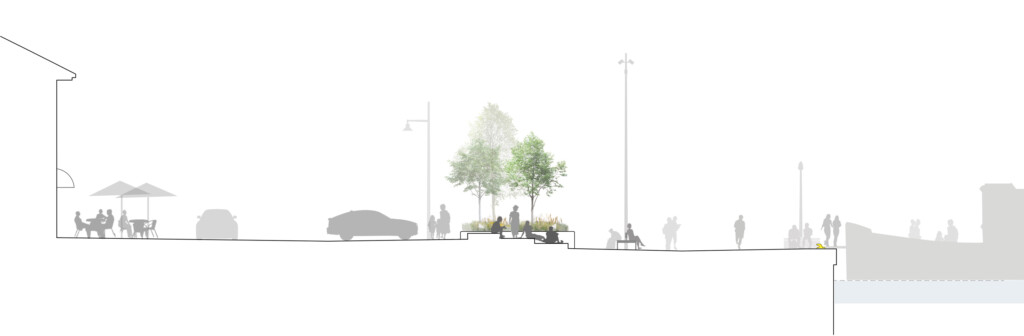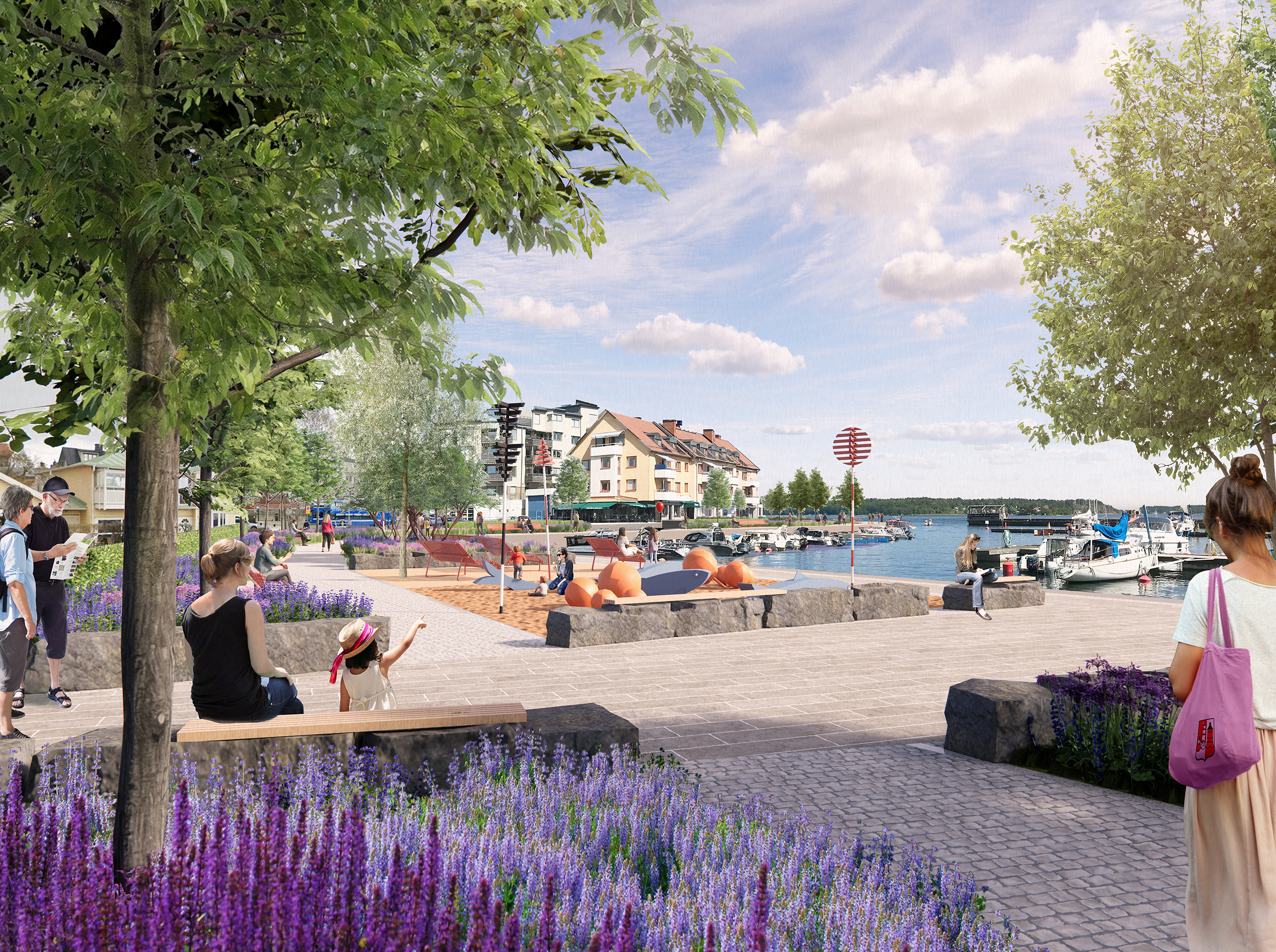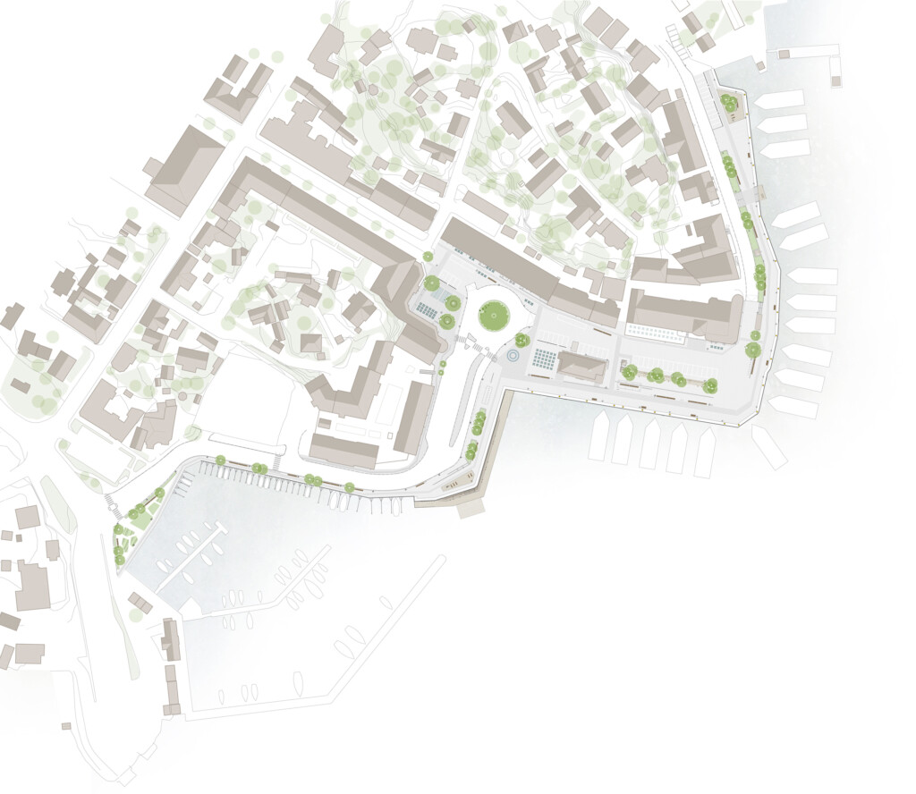 För att knyta ihop och skapa kontinuitet och identitet föreslås en sammanhängande stenbeläggning längs hela kajområdet. Tillgängliga, långsträckta stråk av naturstenshällar byggs ut till platsbildningar på utvalda ställen – platser som bjuder in till lek, vila, väntan och häng. Även möblering är ett sammanhållande element som knyter ihop kajen och skapar atmosfär i samklang med stadsmiljöns historiska identitet. Direktkontakten med havet förstärks med nedsänkta bryggor, och en stor sittgradäng av trä får en central placering i anslutning till båtavgångarna.